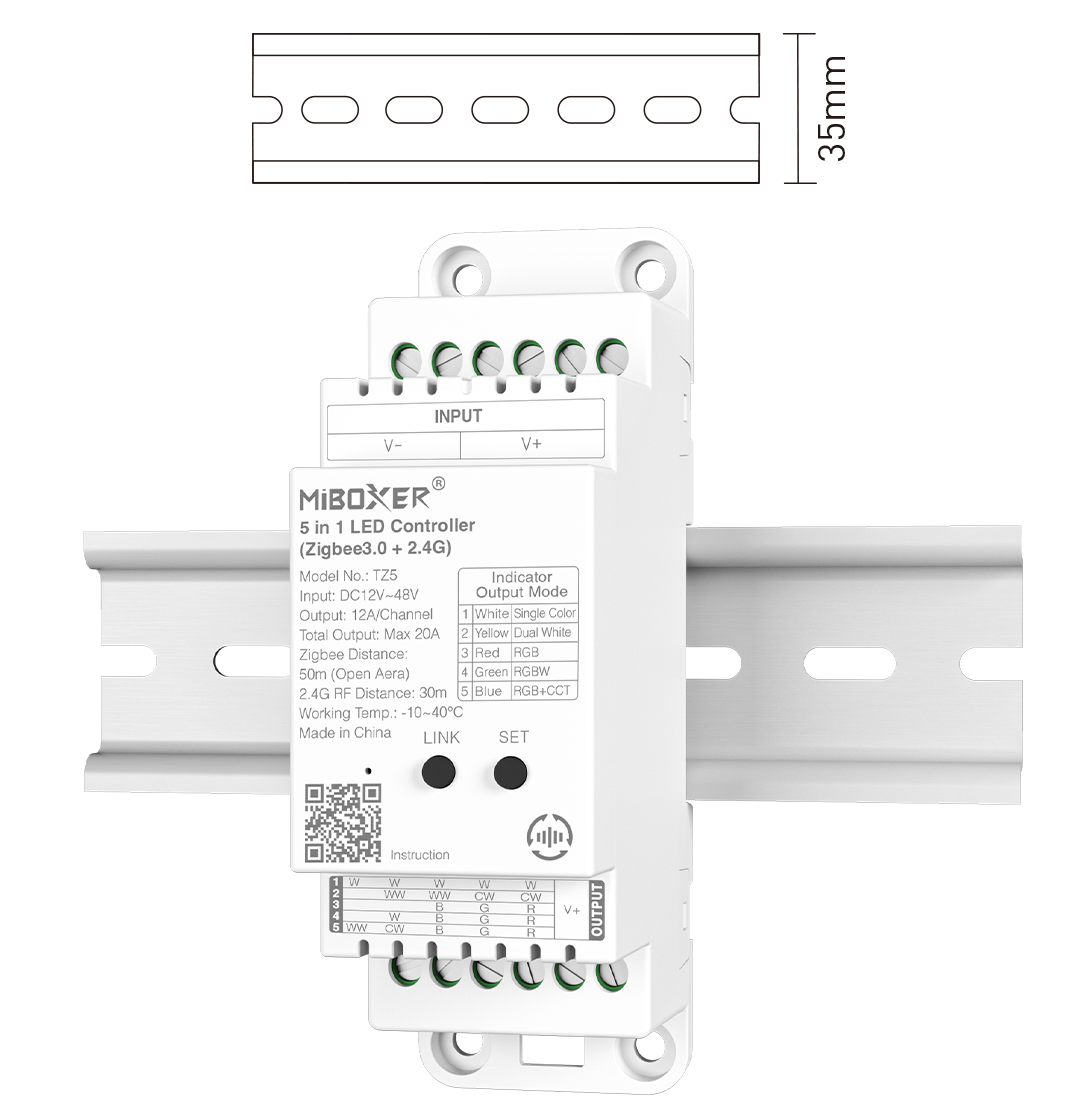 The MiBoxer TZ5 DIN rail Zigbee controller is a professional solution for controlling LED strips in fixed installations such as meter cabinets and control panels. Thanks to mounting on a standard 35mm DIN rail, this controller is ideal for both residential and commercial applications.
